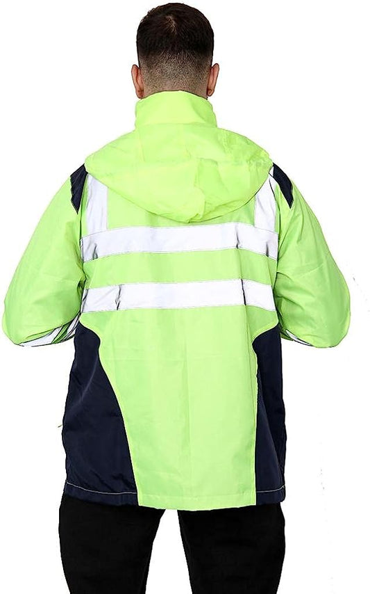 Romaans Hi Vis Rain Jacket Mens High Visibility Waterproof Reflective Tape Band Safety Zipper Hooded Top Lightweight Sizes S to 5XL